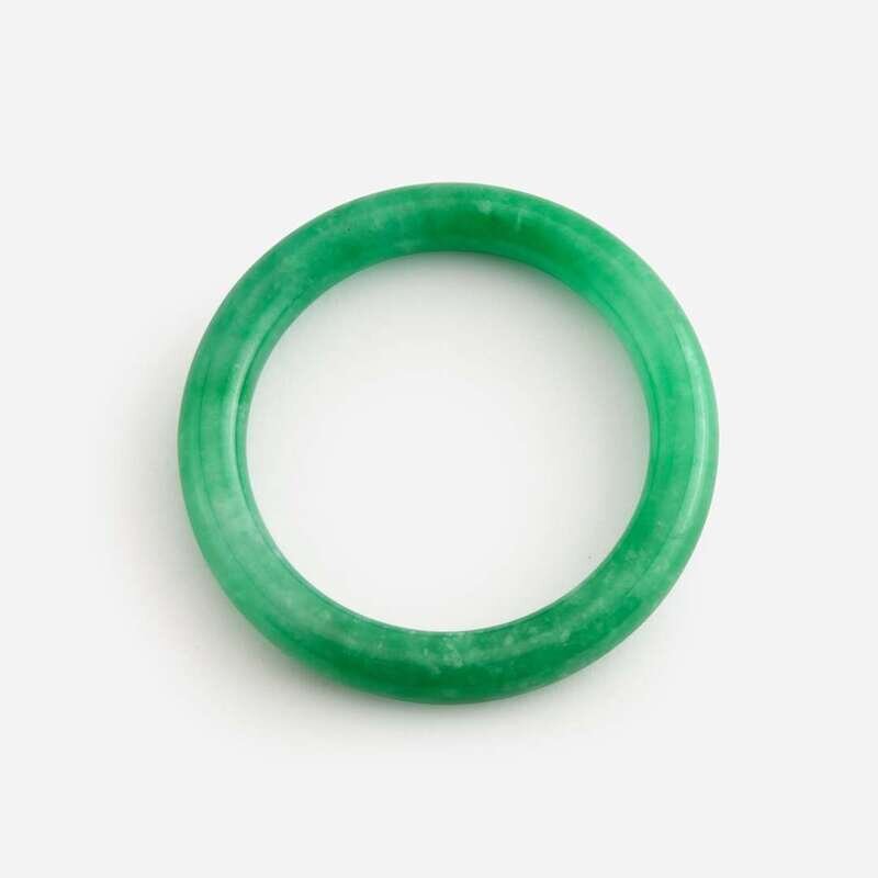 The jadeite bangle of circular section, the stone of moderate translucency and mottled light apple green and white color