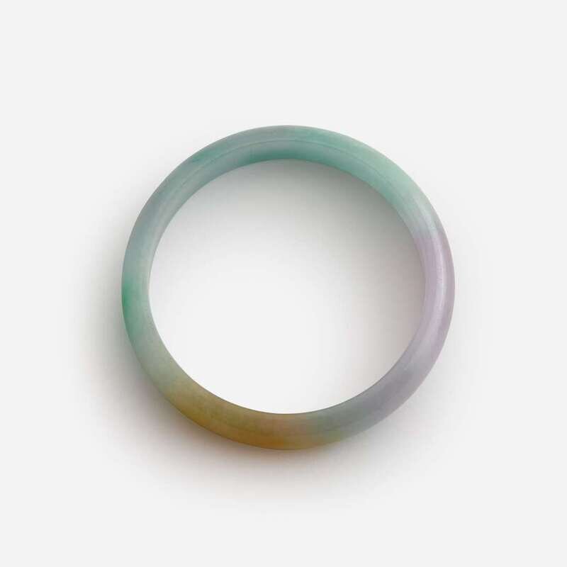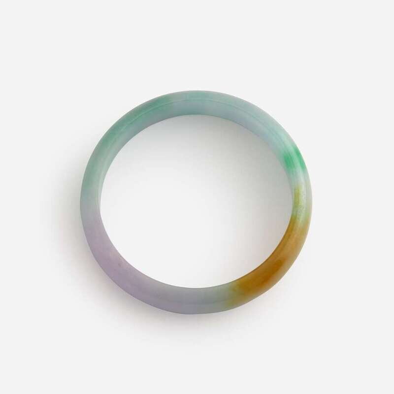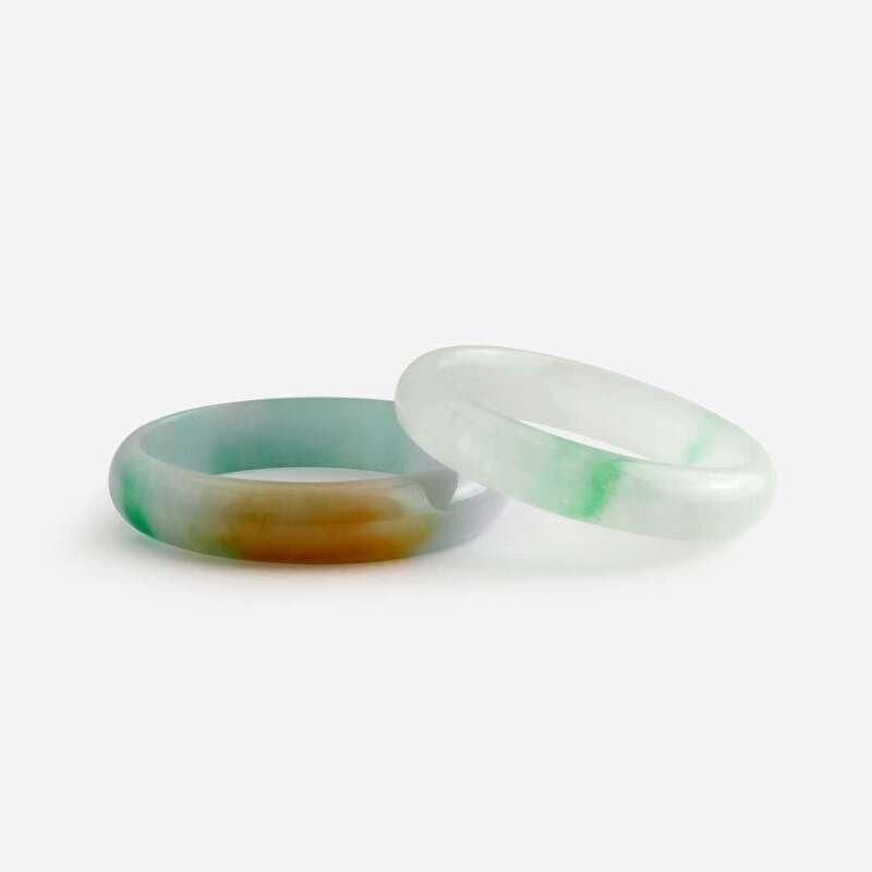Two white and colored jadeite bangles 翡翠贵妃镯一组两件