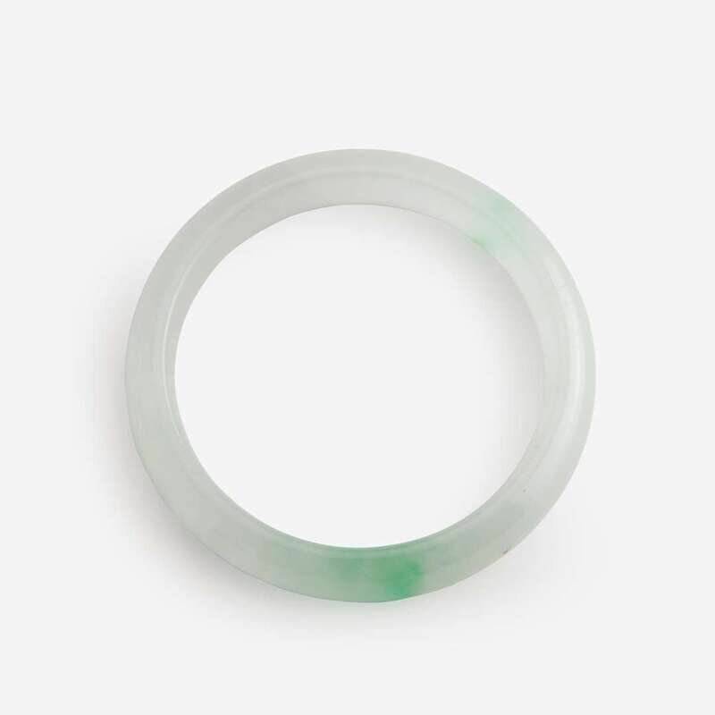 Each of roughly D-form section, one bangle of white with yellow-amber, pale lavender, and light green; the other bangle of white with areas of light green color.