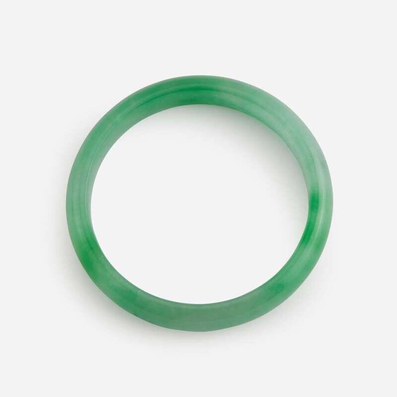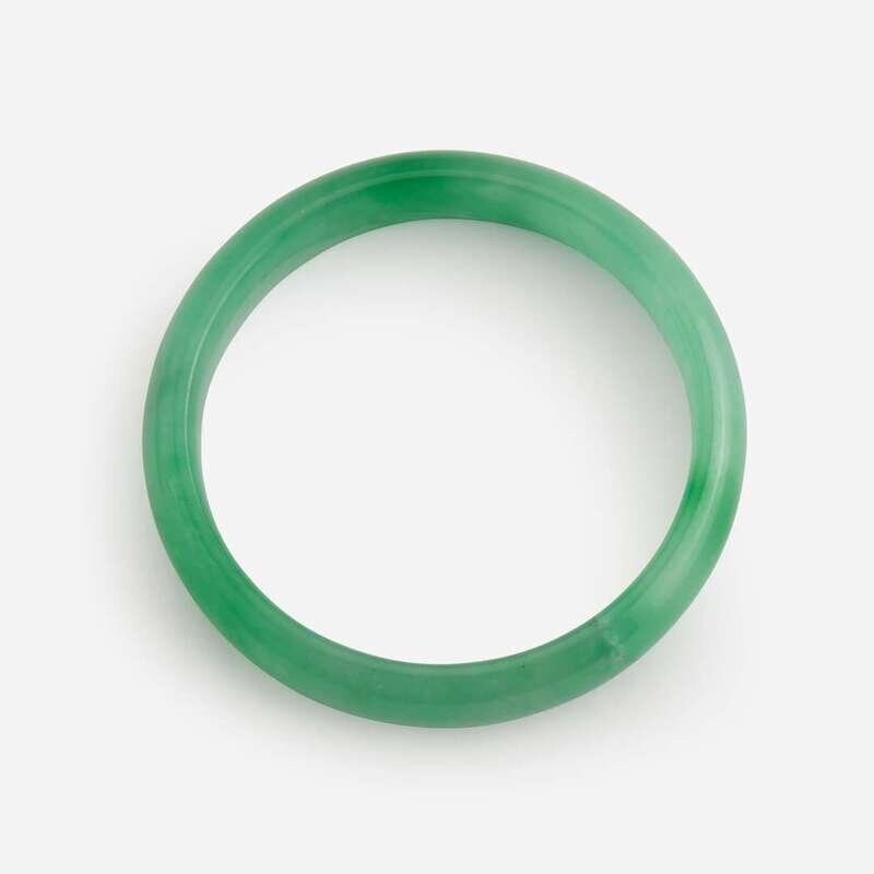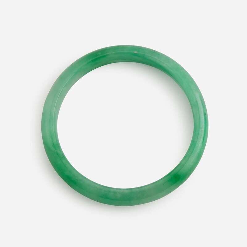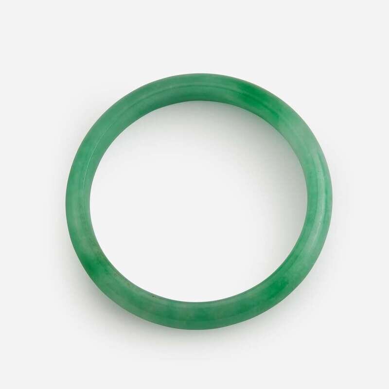 Both bangles of slight D-form section, the stone of mottled white and green