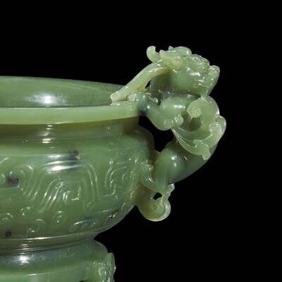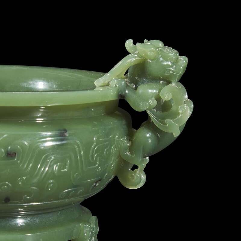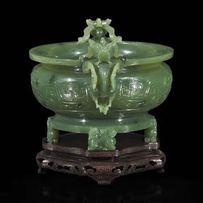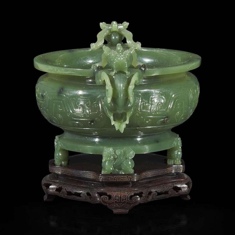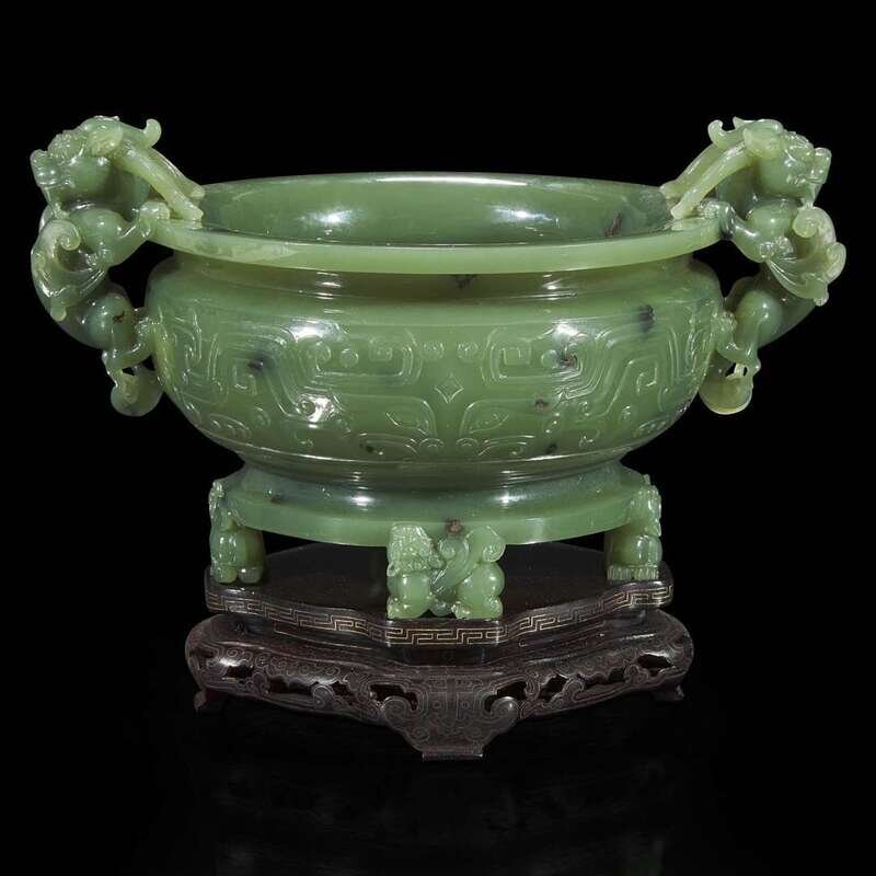 With compressed circular body, the central register carved in low relief with symmetrical archaic taotie motifs; the handles depicted as a pair of winged qilong, their paws on the flared mouth rim, the turned footring raised on four smaller winged qilong, the stone of a very even texture with scattered dark inclusions, with a high polish; wire-inlaid wood stand.