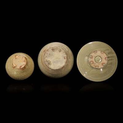 Two Chinese Yue celadon-glazed stoneware jars and a bowl 越窑青釉罐两件及一小碗 Jin dynasty to Tang dynasty ???