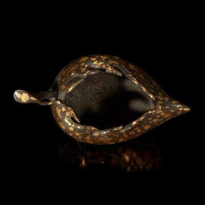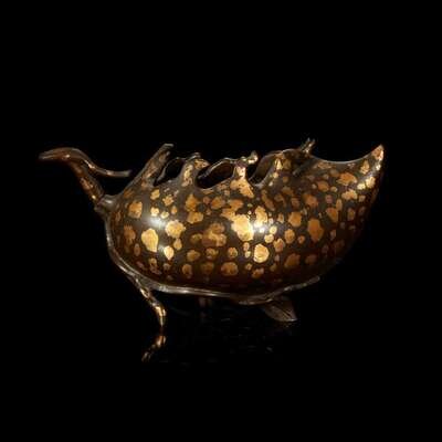 With open top and irregular stylized rim, raised on three feet formed of leaves and stems, separate main stem and tendril, liberally scattered gold splashes against a dark brown patina.