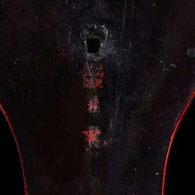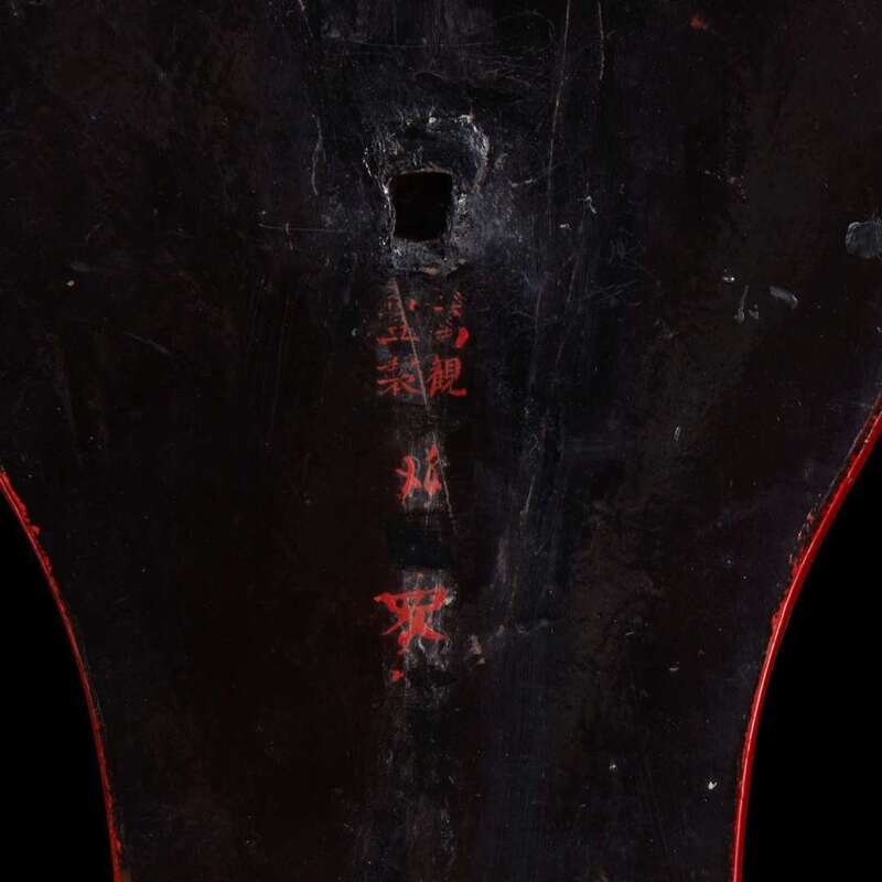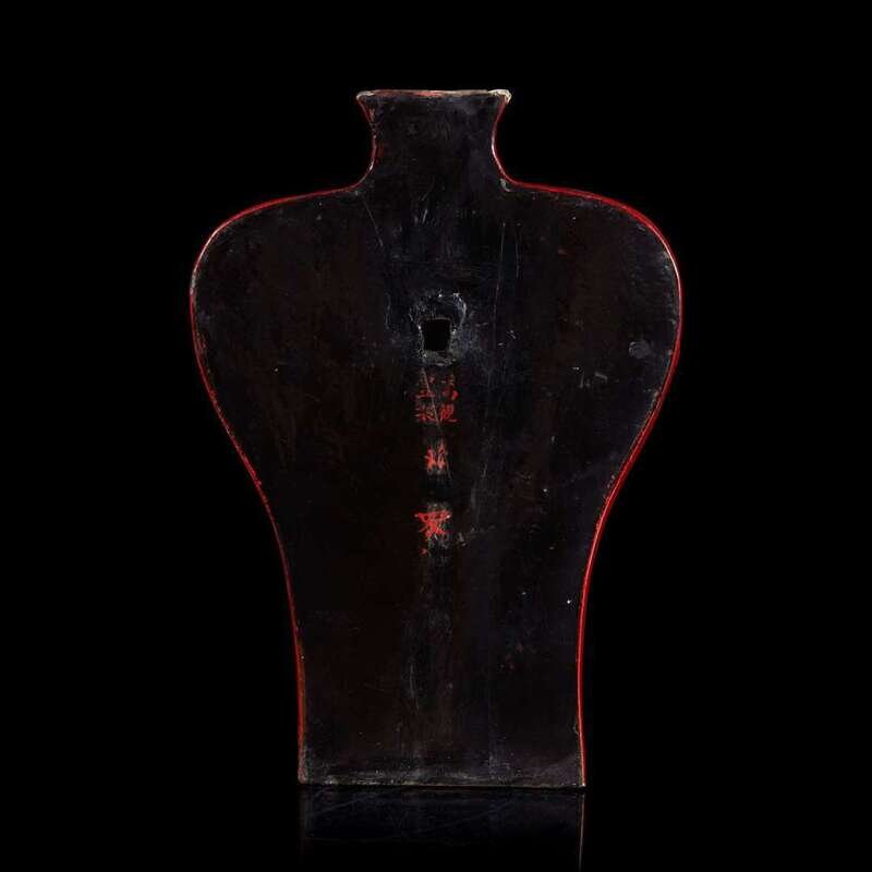 Designed as a half meiping form, with flared lip, flat shoulder, and tall foot; the front of the metal meiping lacquered red, the flat back lacquered black with red lacquered inscription "Wanguan Jianzhi" mark and two indistinct characters, a squared opening for hanging, underside unlacquered.