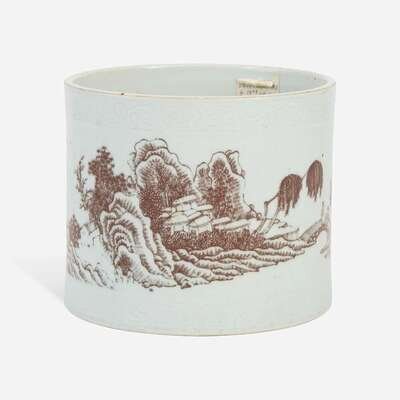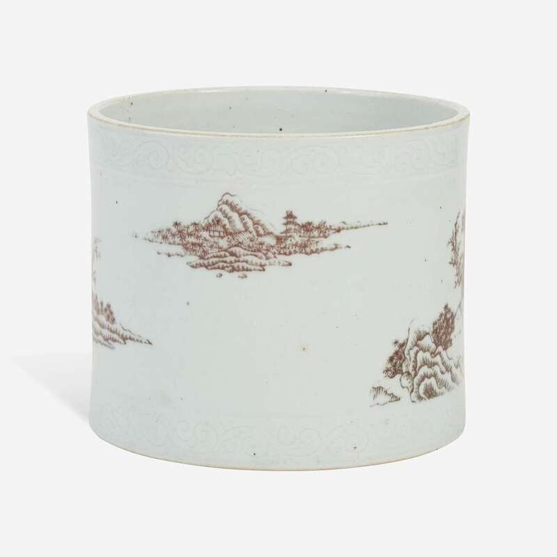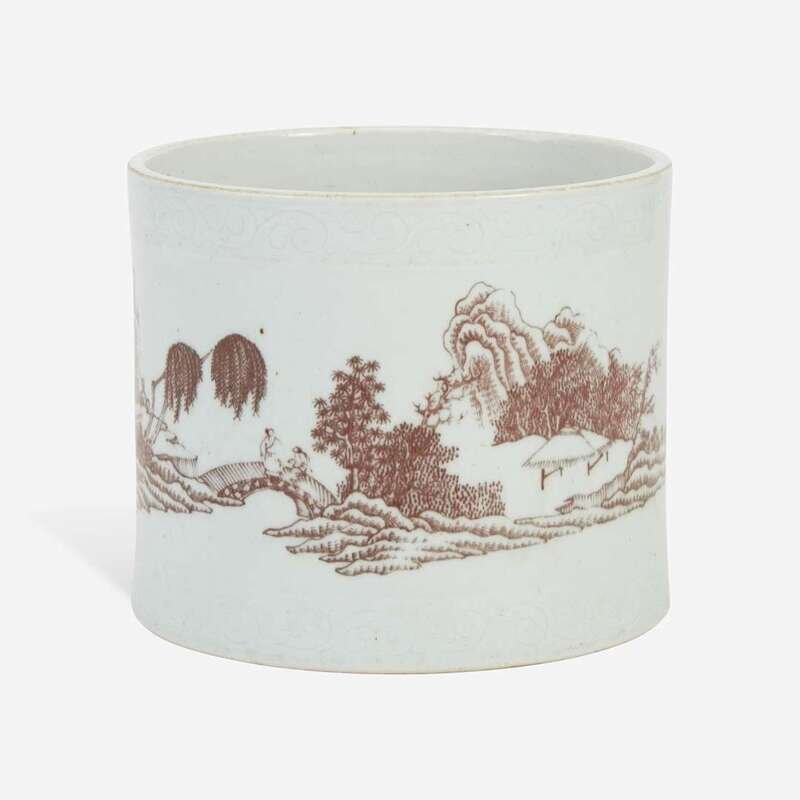 A Chinese underglaze red-decorated porcelain brush pot 釉里红画山水笔筒
