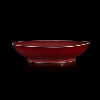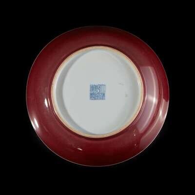 The low circular dish with slightly flared lip, raised on a low foot ring; the glaze of a deep kidney-red, underside with six-character mark in underglaze blue.