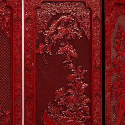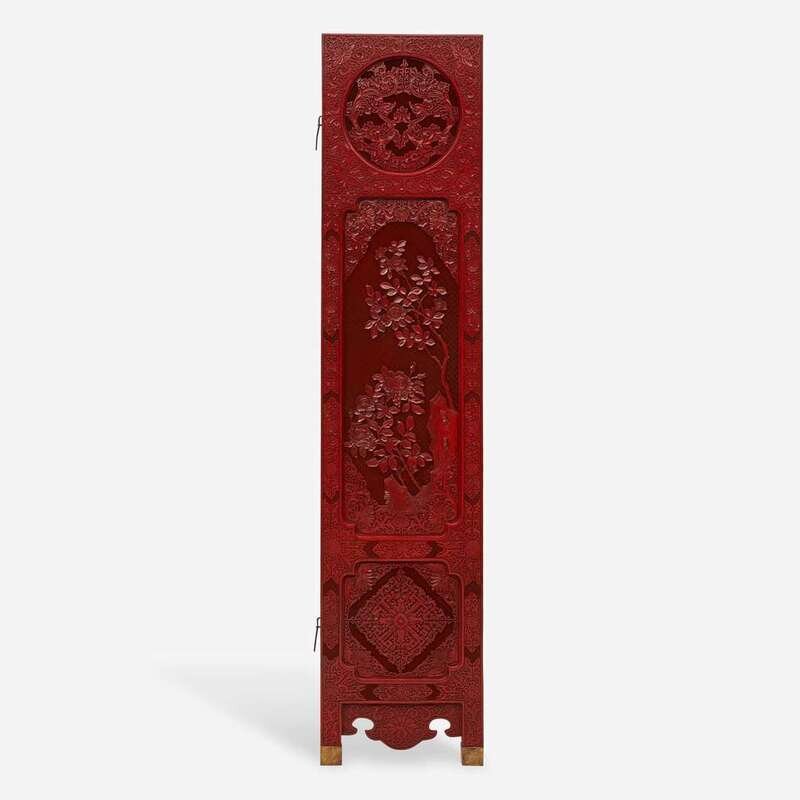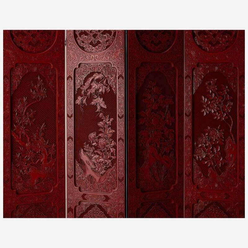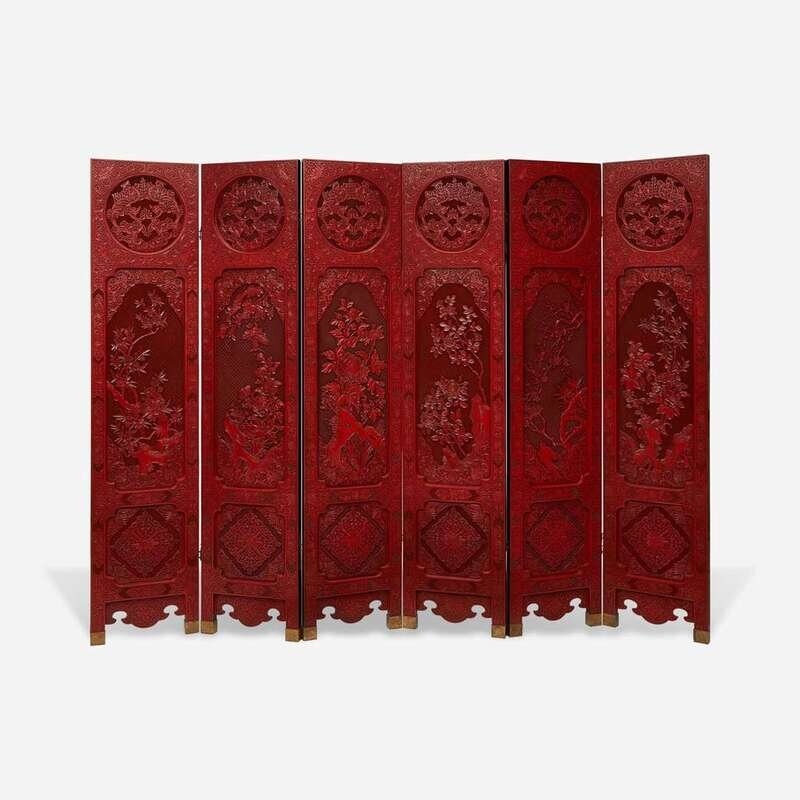 A finely-carved Chinese six-panel cinnabar lacquer wood screen 中国朱红漆六开屏风 20th century ????