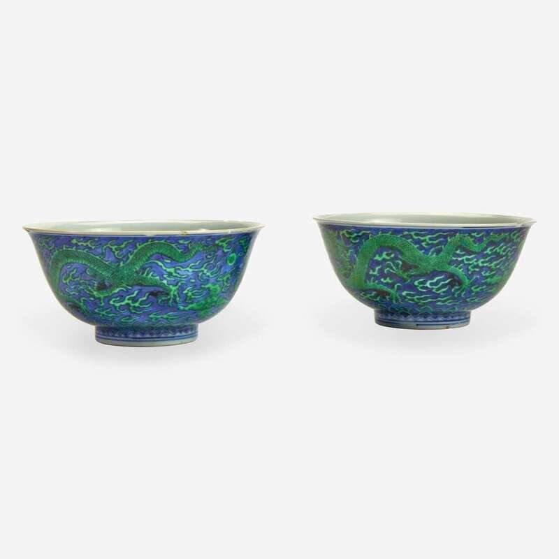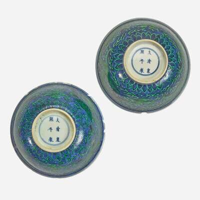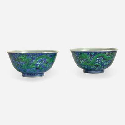 An associated pair of Chinese underglaze blue and green-enameled dragon bowls 珐琅彩青花龙纹碗一对 Kangxi six-character mark and of the period ????? ? ??