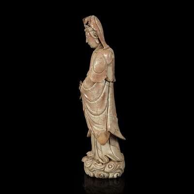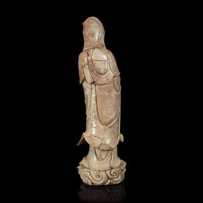 Depicted standing on a scrolling plinth, wearing elegantly draped robes, the bodhisattva's face with a peaceful expression, beneath a lotus diadem, a similar lotus pendant on her breast, her hands brought together at her waist.