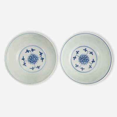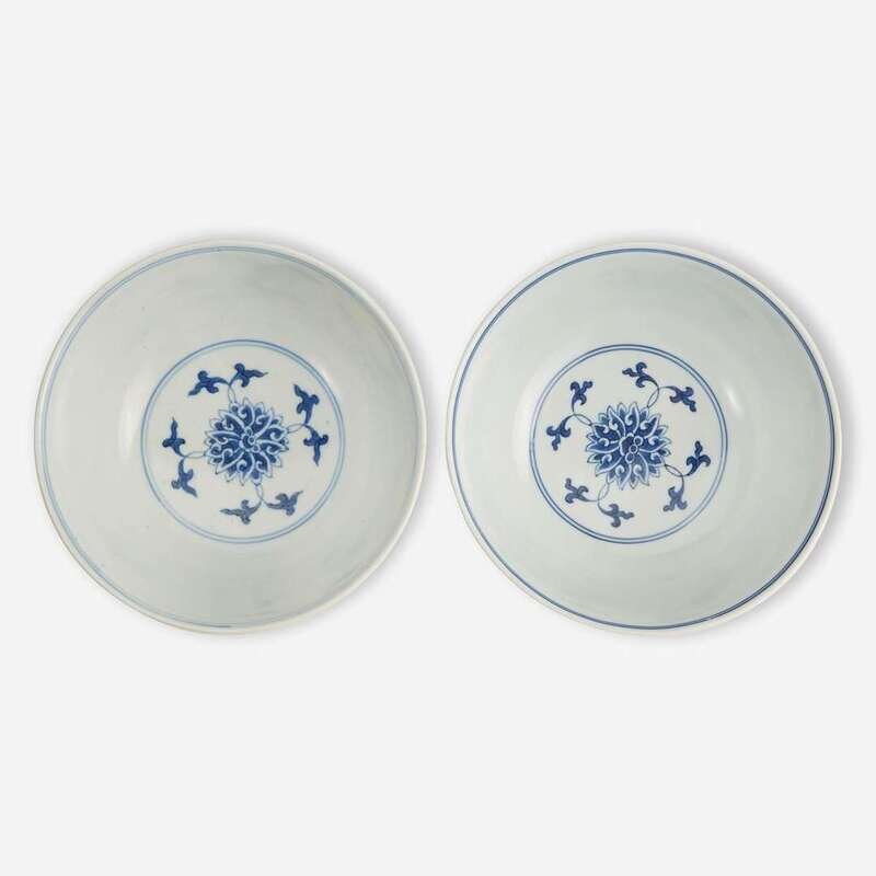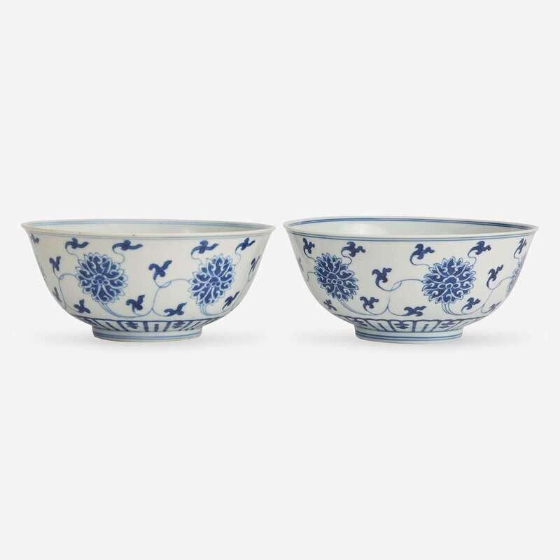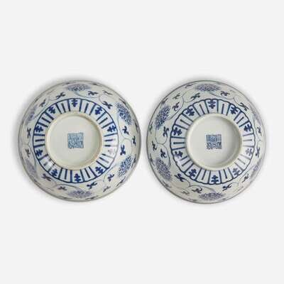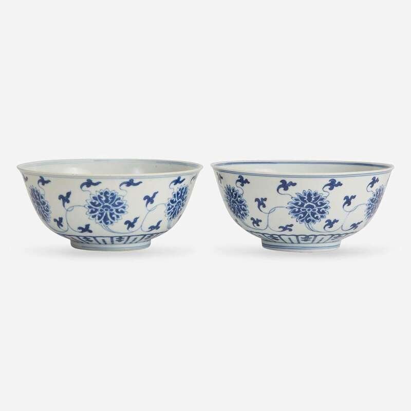 An associated pair of Chinese blue and white porcelain "Lotus" bowls 青花缠枝莲纹碗一对 Daoguang mark and probably of the period ??? ????