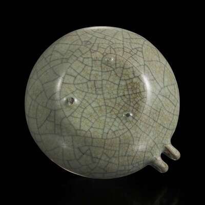 Of compressed spherical form, with twin loops at the shoulder, underside with three spur marks, of an olive-grey glaze with grey and golden-brown-tinted craquelure.