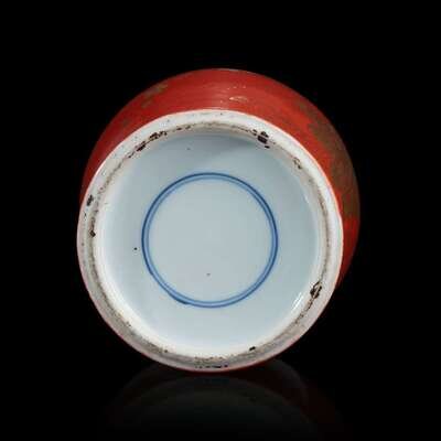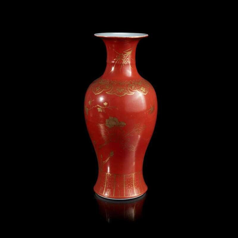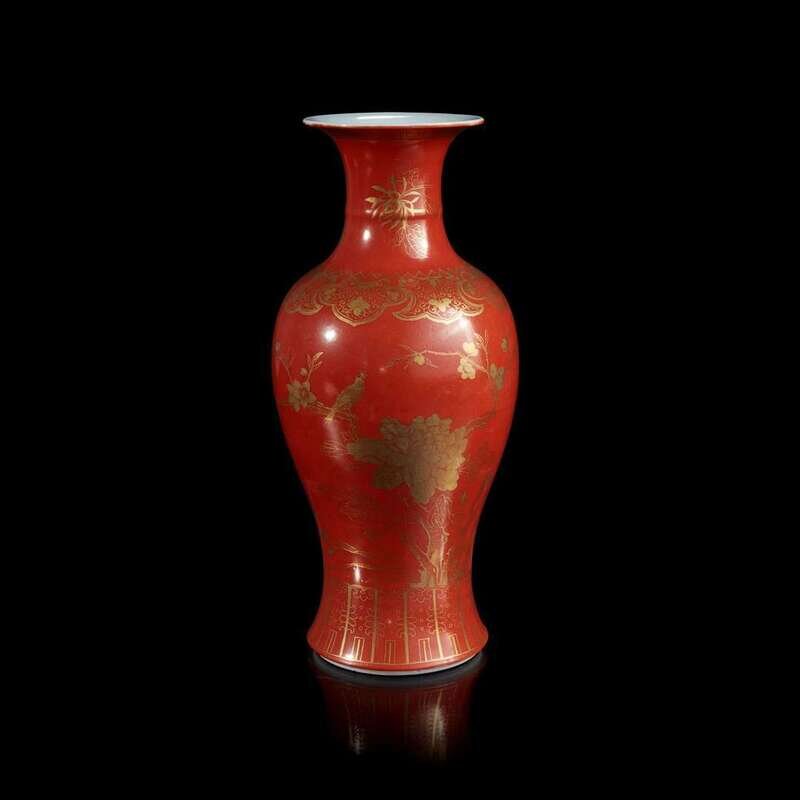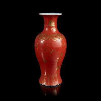 A Chinese coral-ground gilt-decorated baluster vase 珊瑚红地描金凤尾尊 Qing dynasty ?
