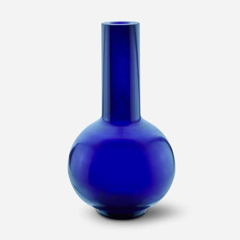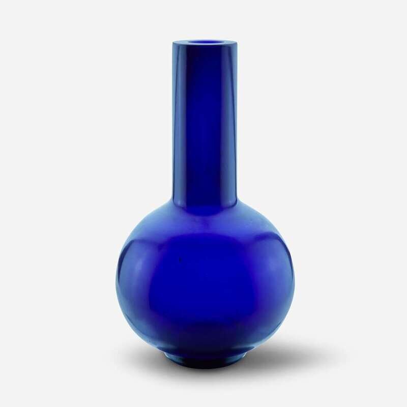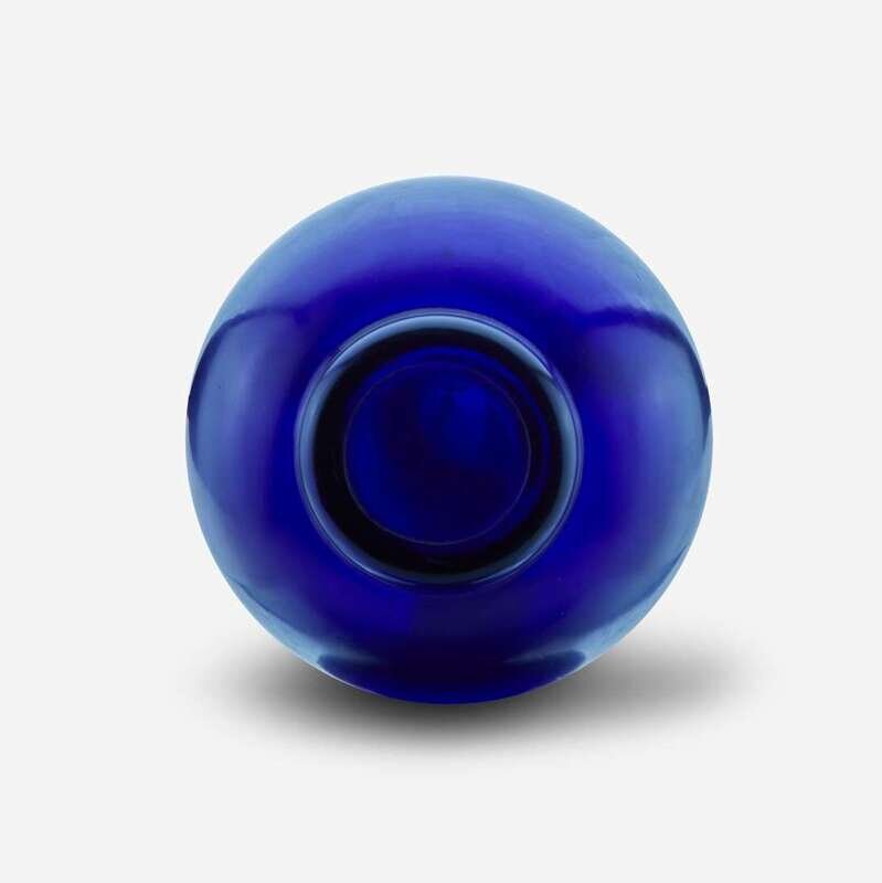 Of "Tianqiuping" form with long cylindrical neck, spherical body, and rounded footring, the glass of a rich, deep violet blue with softly-polished surface.