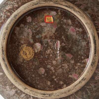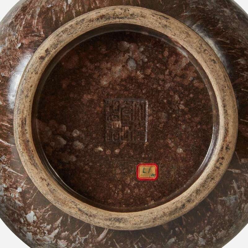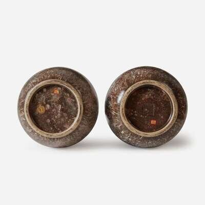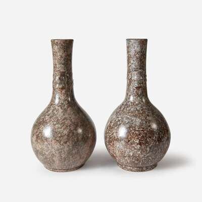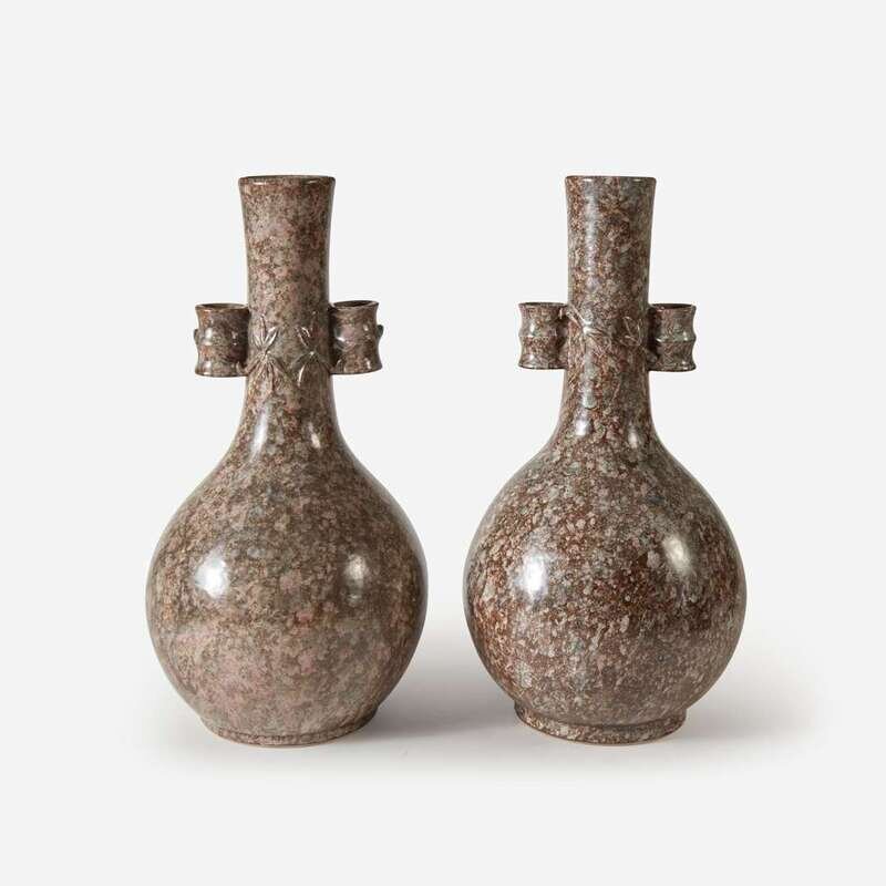 Of pear-shaped form with slender vertical neck, flanked by a pair of ridged tubes and applied "bamboo", with a mottled grey-blue, moss-green, pink and brown-enameled surface, underside of one with six-character seal mark, apparently reading "Da Han Guangwu Zhi Zao", the other vase with indistinct impressed six-character seal mark.