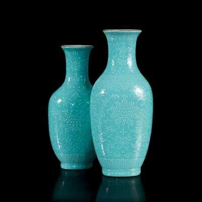 Of differing heights, vasiform, decorated with white slip lotus scrolls and ornamental borders, undersides with apocryphal six-character Qianlong seal marks