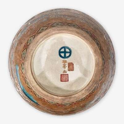 Incorporating "Gosu" blue, decorated with bamboo fences, chrysanthemums and flowers, floral and foliate lappets to the shoulder, coin and florette pattern to mouth; maker's marks "Baiho ga" and Shimazu mon to the underside.