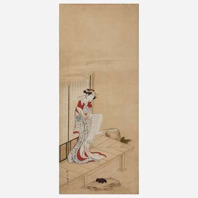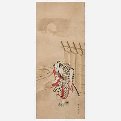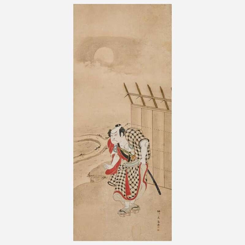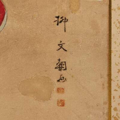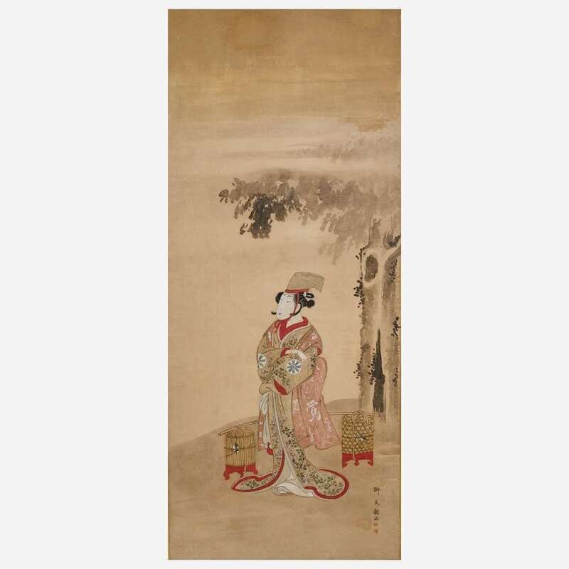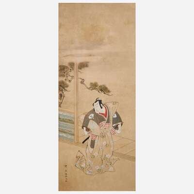 Ink and color on paper, inscribed, brocade and lacquer mounts