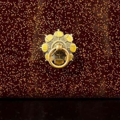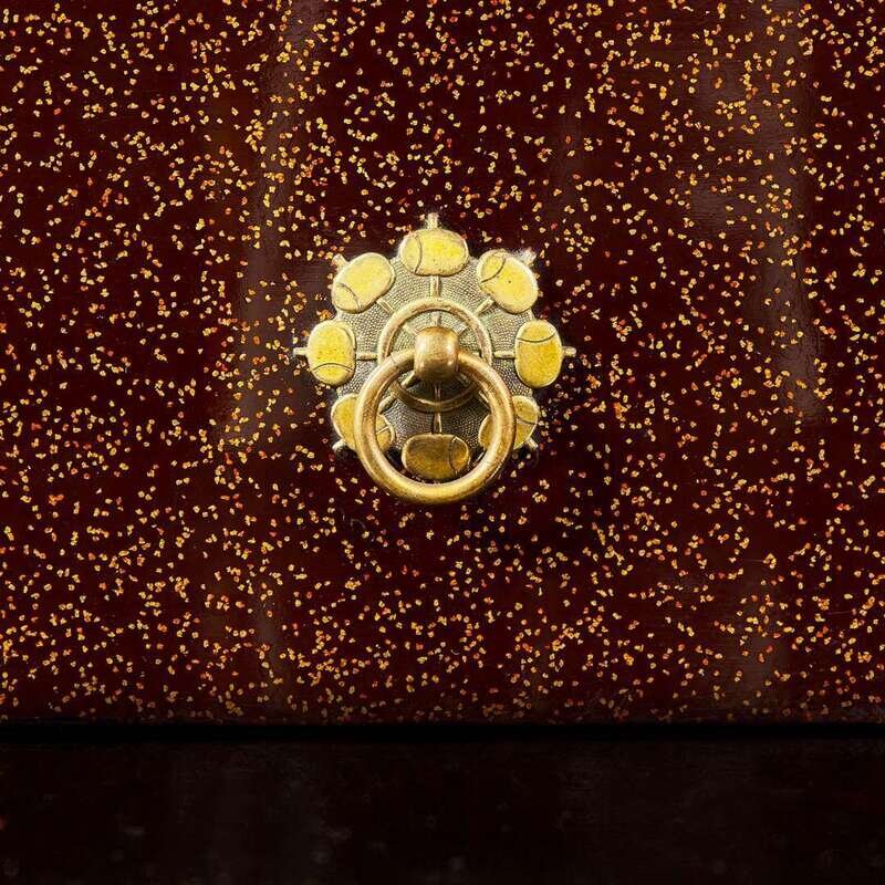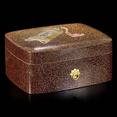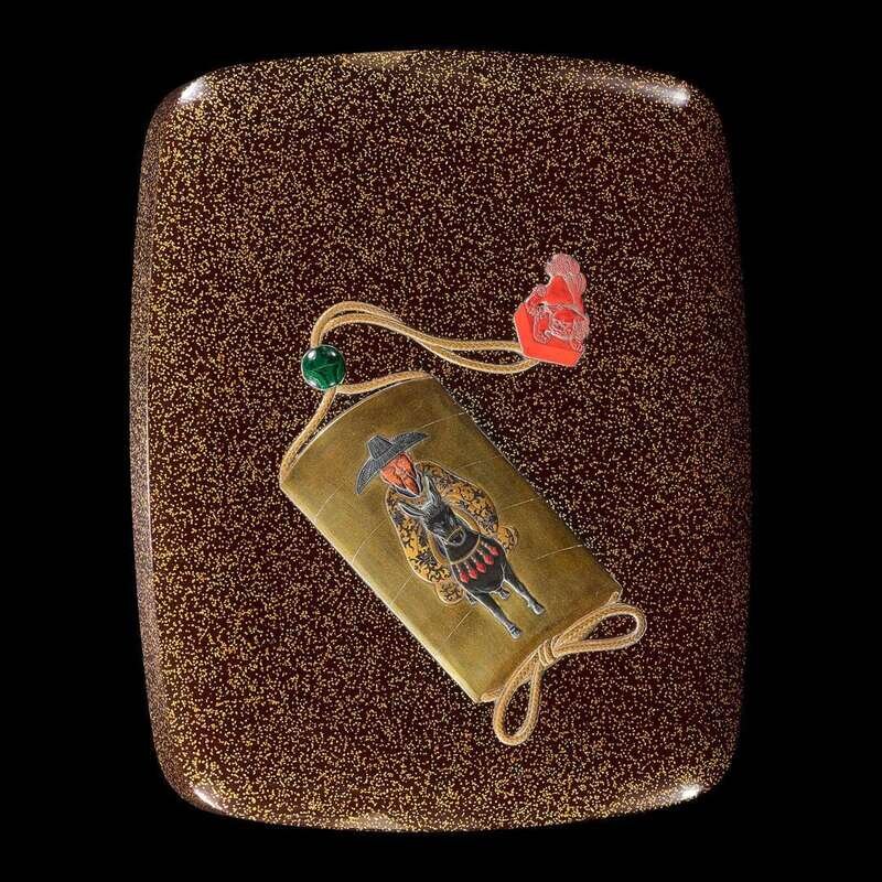 The tall rectangular body with rounded edges, lacquered and inlaid with an "inro" decorated with a bearded man with elaborate floral pattern robes on a mule, inset malachite "ojime", and a red lacquered lion seal-form "netsuke", all in gold and colored takamaki-e, all on a hirameji ground; gilt metal ring mounts in the form of radiating Daikoku hammers on two sides; nashiji interior; Japanese wood box.