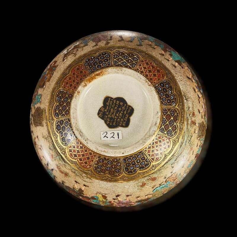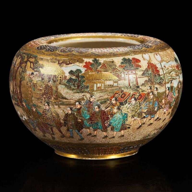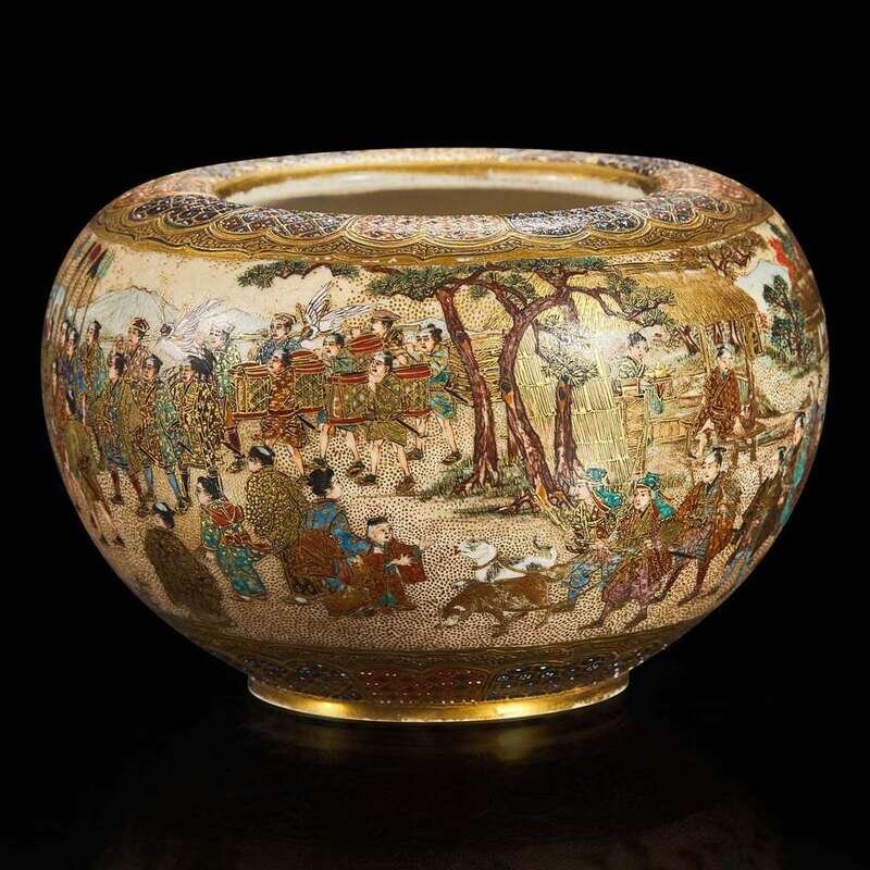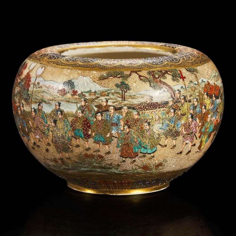 Of compressed spherical form, the lower and upper borders decorated with a band of diapered petal-form lappets, the center with an elaborate procession, Fuji in the distance, underside with floret-form cartouche signed Ryokuzan and with lengthy inscription.