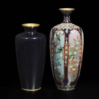 Executed in fine silver wires, the taller, by the Ota cloisonné workshop, of midnight-blue ground with six lobes decorated with landscapes, birds and flowers, stamped "Daikitchi" to the underside; the other decorated with bamboo, flowers and sparrows, all against a midnight blue ground.