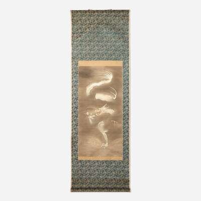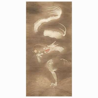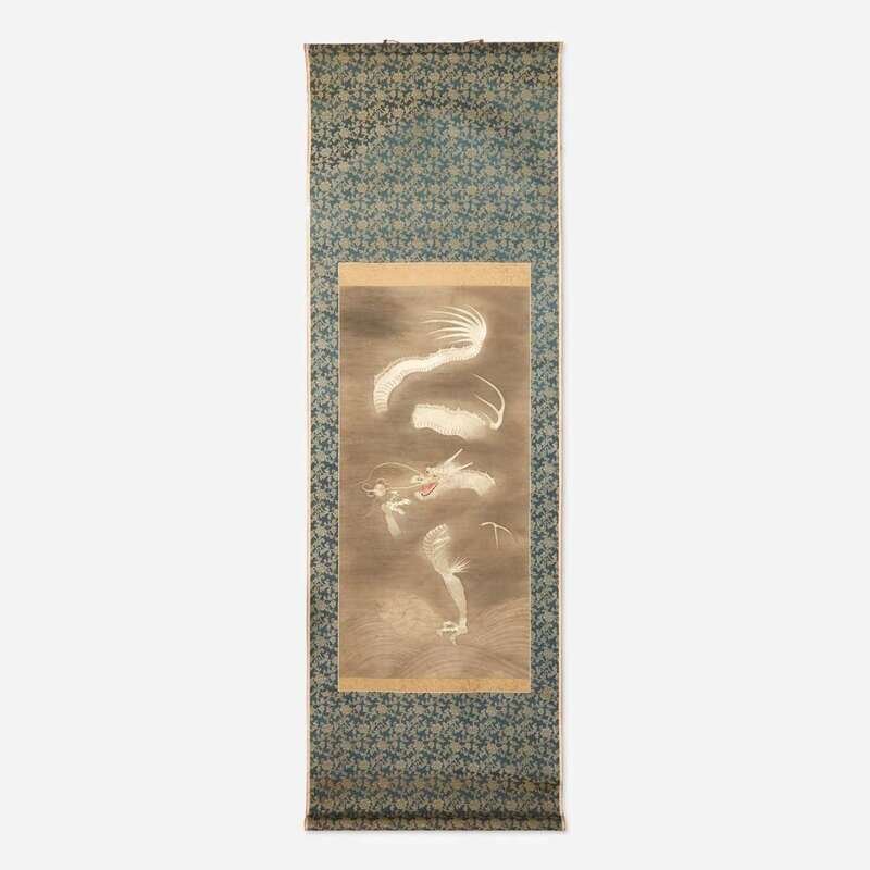 The silvery three-clawed sinuous dragon depicted emerging from the mist above rolling waves, chasing a flaming jewel, mounted as a hanging scroll.