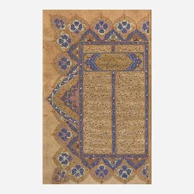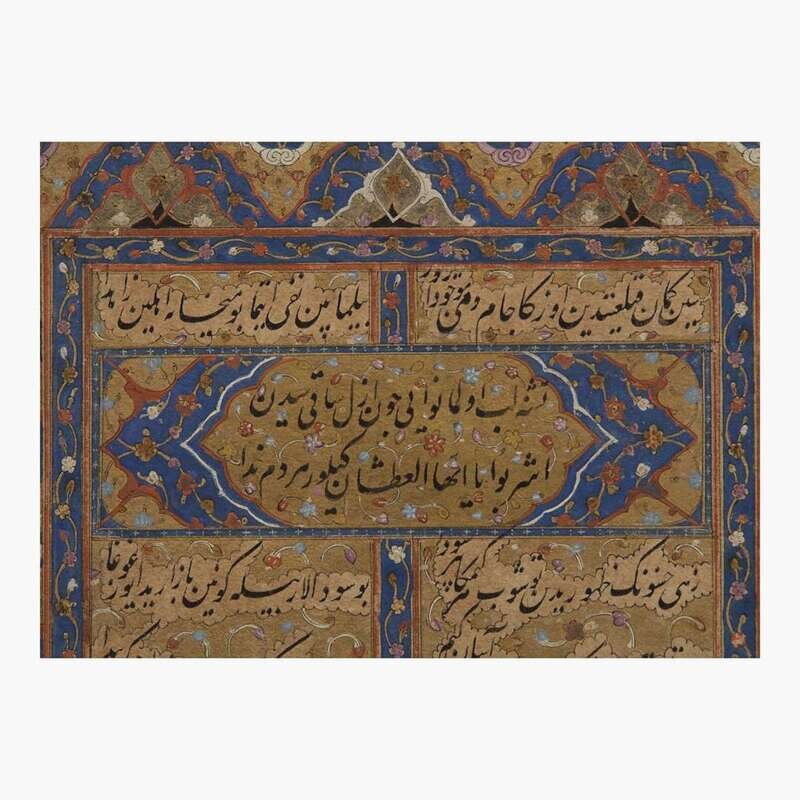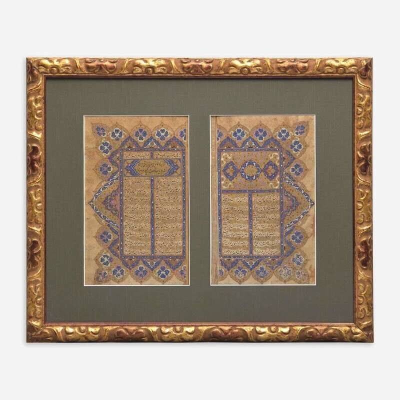 Ink, opaque colors and gold on paper, framed, matted and glazed.