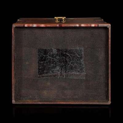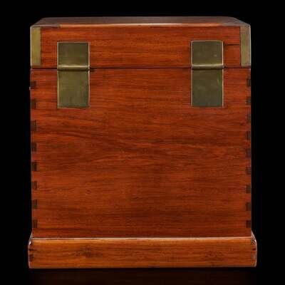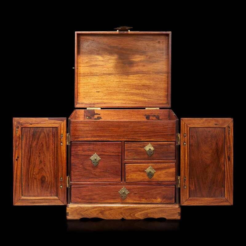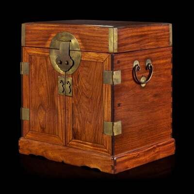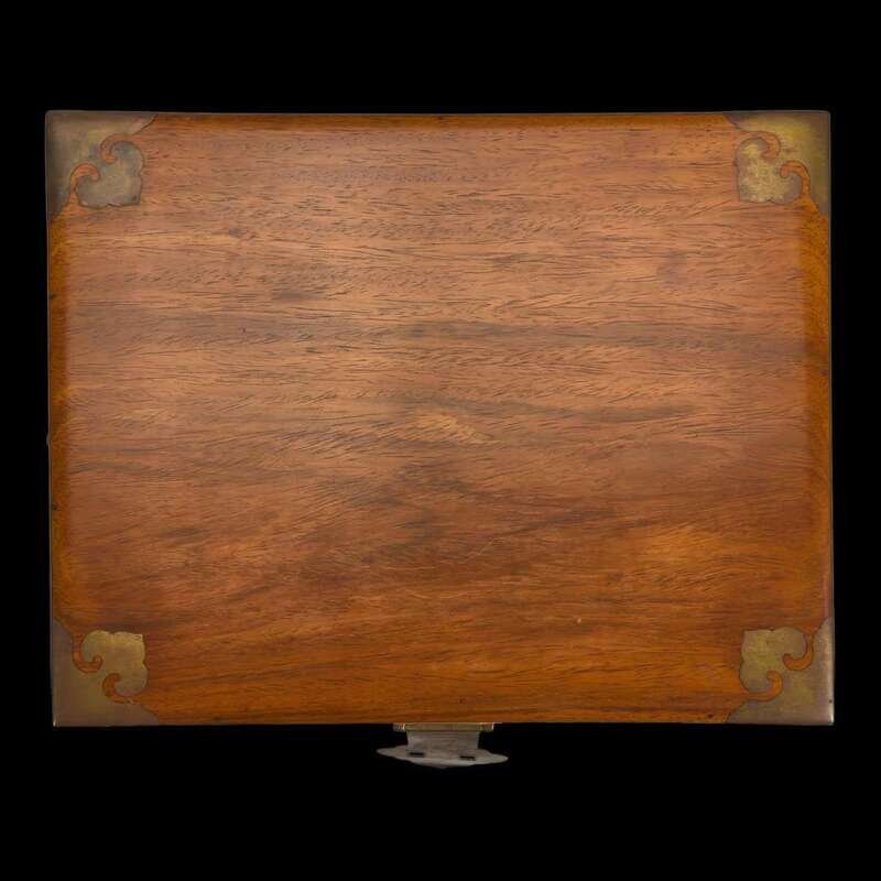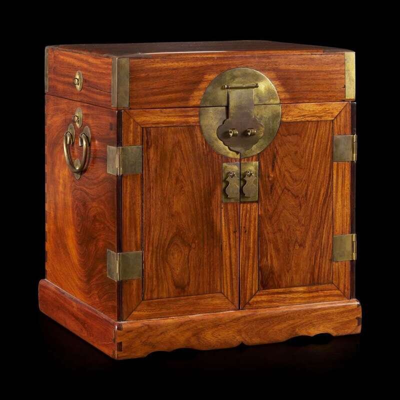 Of rectangular form, with lift lid and two front doors opening to an upper compartment over a deep drawer, two smaller drawers and a long drawer; brass mounts, brass bail handles; the wood of a rich honey-brown tone. Brass Chinese lock and key.