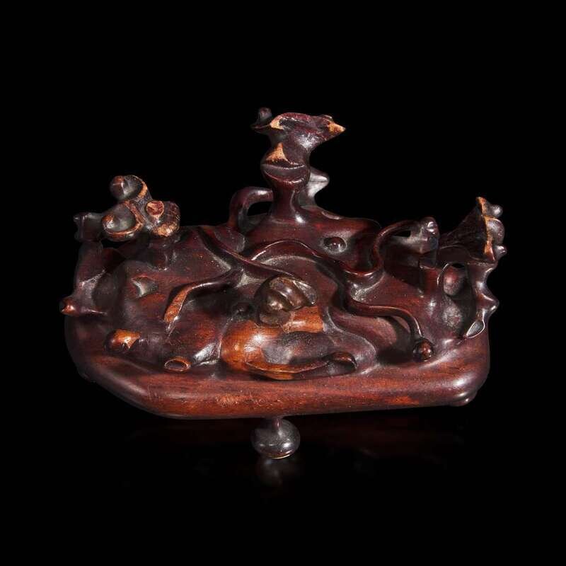 Of irregular natural form, the stone of grayish white to beige-brown; the wood stand intricately carved with openwork and tendrils, all on four spreading feet.