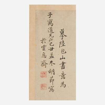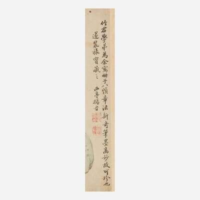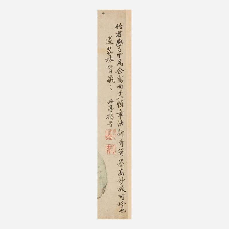 Ink and color on paper, inscribed and with two seals upper left, inscribed upper right by Yang Jin (1644-1728) and with two seals along right side, two additional seals lower left; dated equivalent to 1709; mounted framed, matted and glazed.