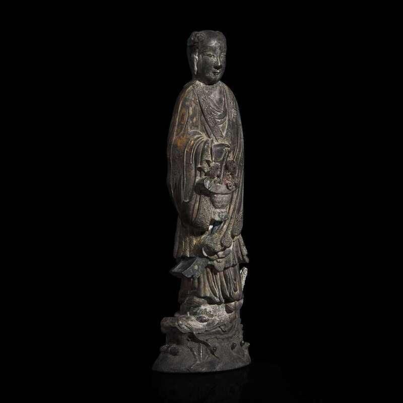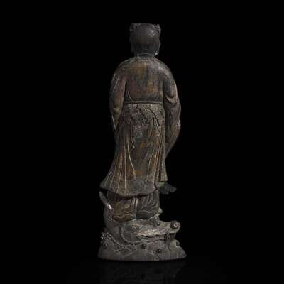 Depicting the Daoist immortal with serene facial expression, holding a basket of lingzhi in the right hand, standing on a dragon head, above finely detailed waves; the immortal's sleeves and collar finely decorated with band of diaper and floral patterns, leafy belt; partially gilded body and silver lacquered dragon horn, molded Hu Ziqing Qianzhi mark on the side of a basket of grasses and lingzhi