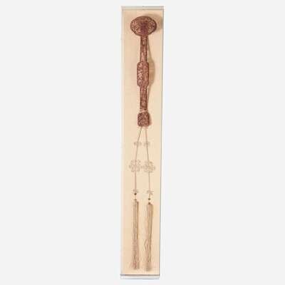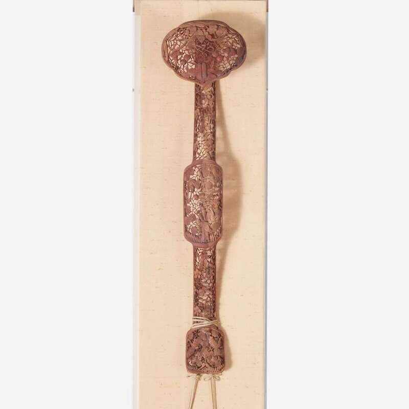 Carved in intricate openwork with a sage in a pine grove under the moon, a descending bat bearing a peach spray, additional descending bats with endless knot and a chime to head and base, the body with prunus blossoms; silk double tassel with elaborate knots, all in a later acrylic shadowbox mount.