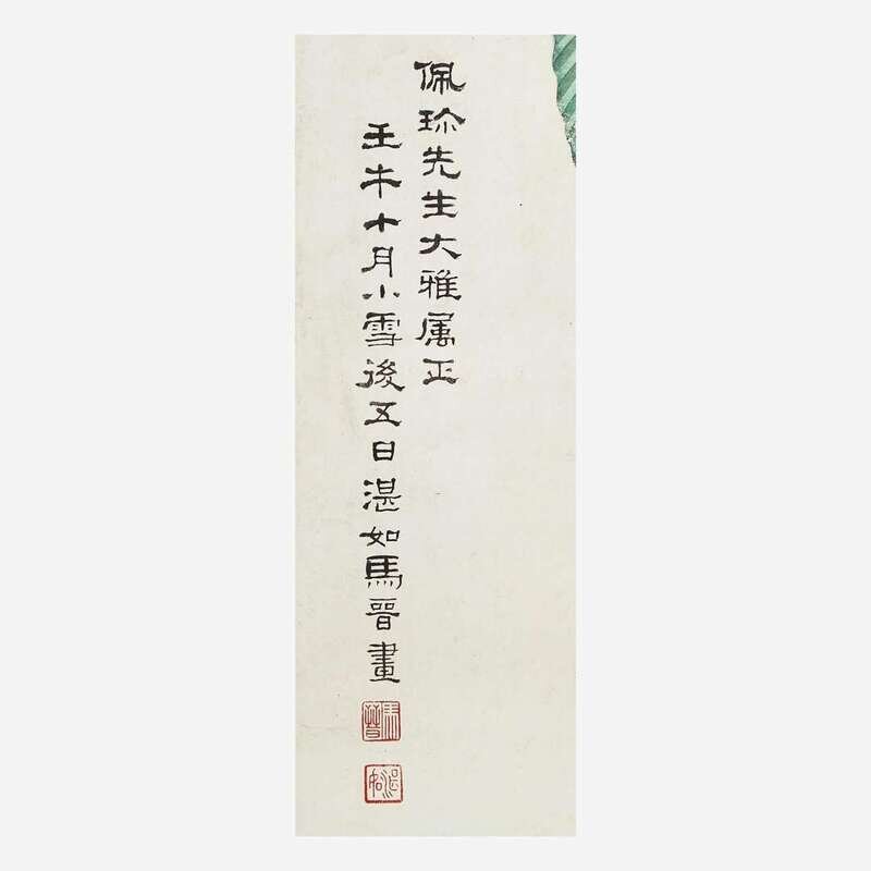 Ink and color on paper, inscribed and with two seals upper left, with a cyclical date equivalent to 1942, mounted, framed and glazed.