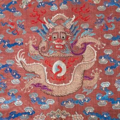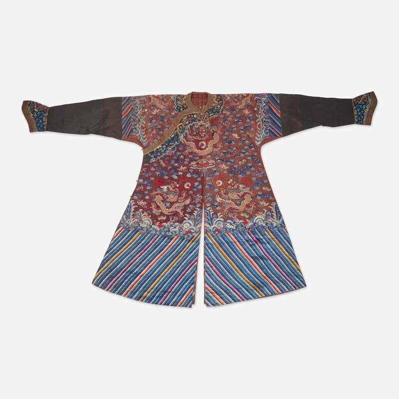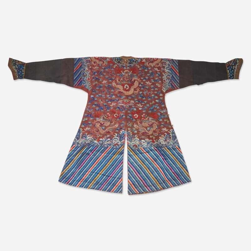 Of maroon-purple ground fading to a brownish-plum, embroidered in colorful silks and couched metallic threads with nine sinuous dragons among clouds, flames, bats, peaches and other auspicious Daoist and Buddhist symbols, all above a lishui band, rolling waves and rockwork. Diaper-patterned borders to neck and sleeves.