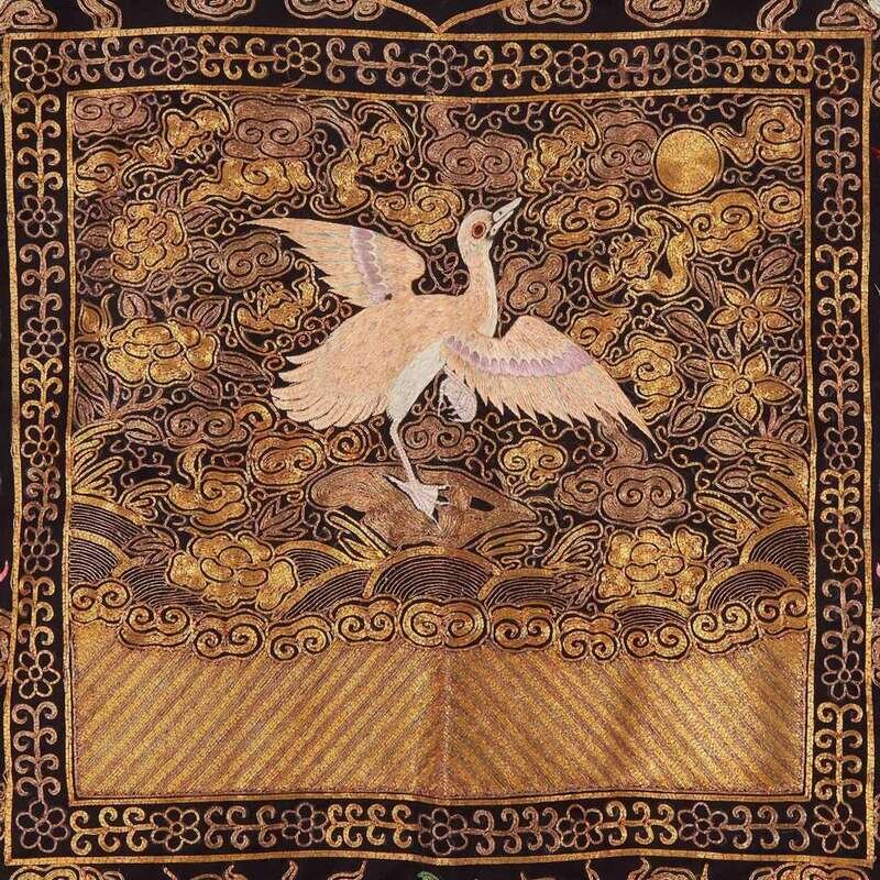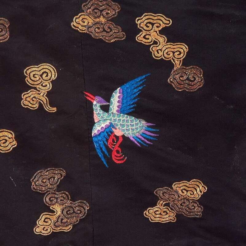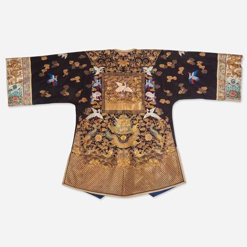 Of black silk, centered on front and back with a couched gold thread and silk-embroidered civil rank badge, possibly a fourth-rank wild goose, among exotic flying birds and gold scrolled clouds, above a pair of multicolored and gold four-clawed dragons to the from, a larger dragon and flaming pearl verso, above peony and lotus blossoms, and "dragon-fish", all above a lishui skirt of varying tones of gold, the sleeves with couched-gold phoenix and dragons, above colorful lishui and flowers