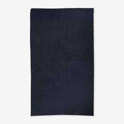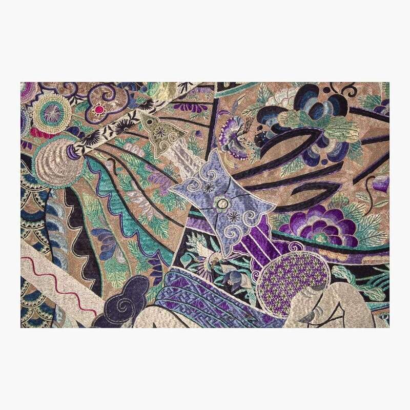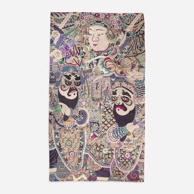 Of grand scale, the ground nearly covered with silk-work and couched metallic threads, depicting a central beardless warrior flanked by two smaller bearded warriors, the robes and ground elaborately patterned, including figural bands likely related to Chinese opera, blue-dyed cloth backing.