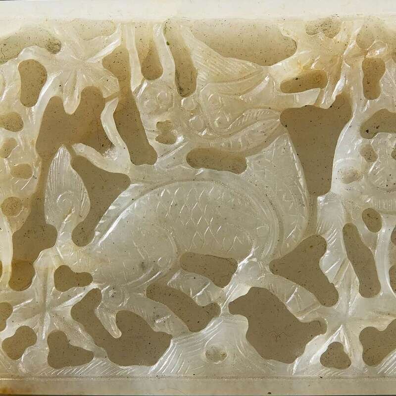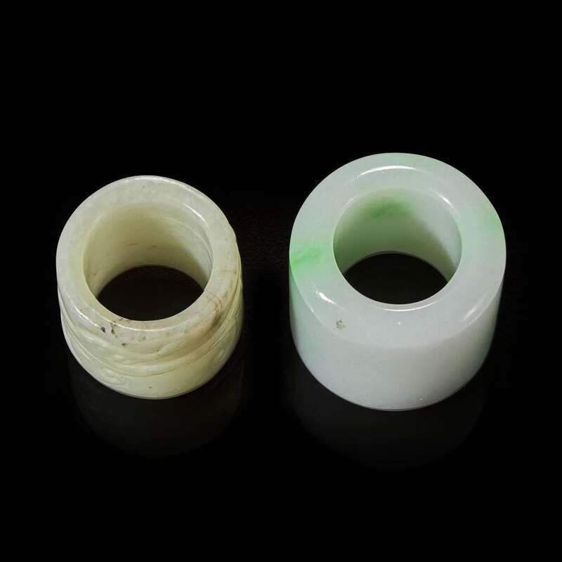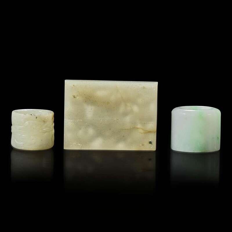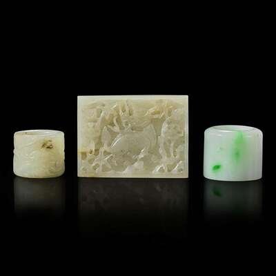 Comprising a greyish-white jade thumb ring carved in low-relief with a qilong; a larger jadeite thumb ring of even white tone suffused with vivid green, fine polish; and a greyish-white jade rectangular plaque carved with a qilin among flowers and foliage.