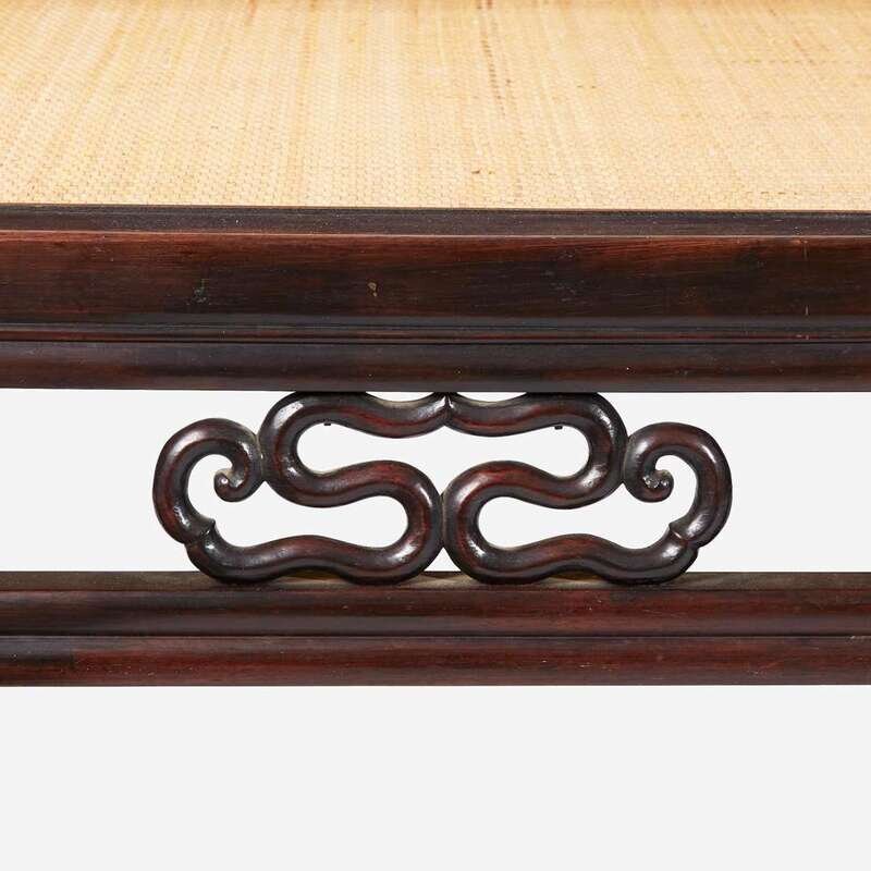 Of long rectangular form, with woven cane top, and caned cylindrical headrest; the shaped back with three panels carved with flowers, all over a front with humpback stretcher, two long drawers, and a central open scrollwork element, the square legs terminating in scrolled feet, the deep red-brown timber, possibly hongmu, heavy and dense.