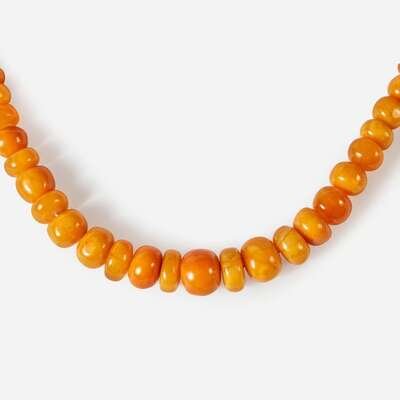 Comprising 85 various sizes amber beads, ranging from approx 6mm to 25mm diameter; the opaque to translucent colors from vivid orange-yellow to rich caramel, total weight 150.8 grams