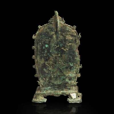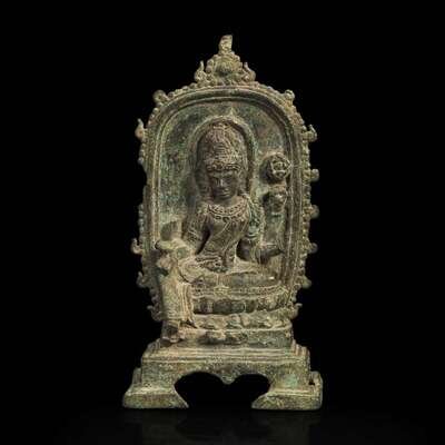 Depicting a bodhisattva, possibly Maitreya, with a stupa in their crown, with six arms, one hand holding a lotus flower, sitting on a lotus base supported on a four-legged plinth, framed by a crown and an oval halo, all against mandorla bordered with flames