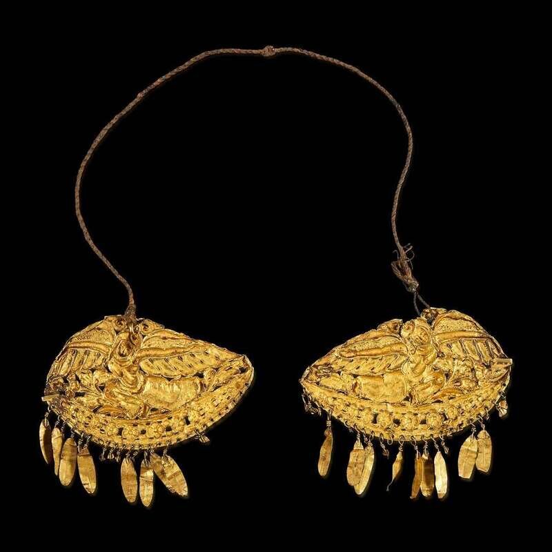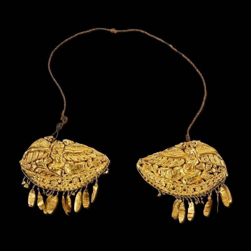 Depicting a pair of winged deities with serene facial expression, with elaborate dress and dancing on a floral ground, their hair in a charming scrolled style, leaf-like ornaments suspended from the lower border, the plaques connected by coiled twine. Gold approx. 19 dwt.