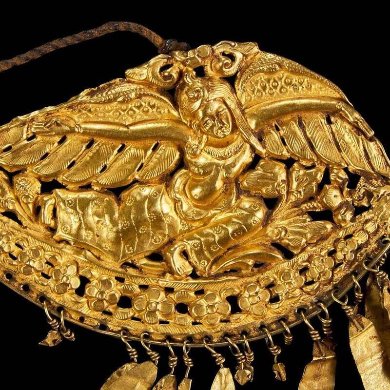 A pair of Asian gold repoussé plaques 錾刻金牌饰一对