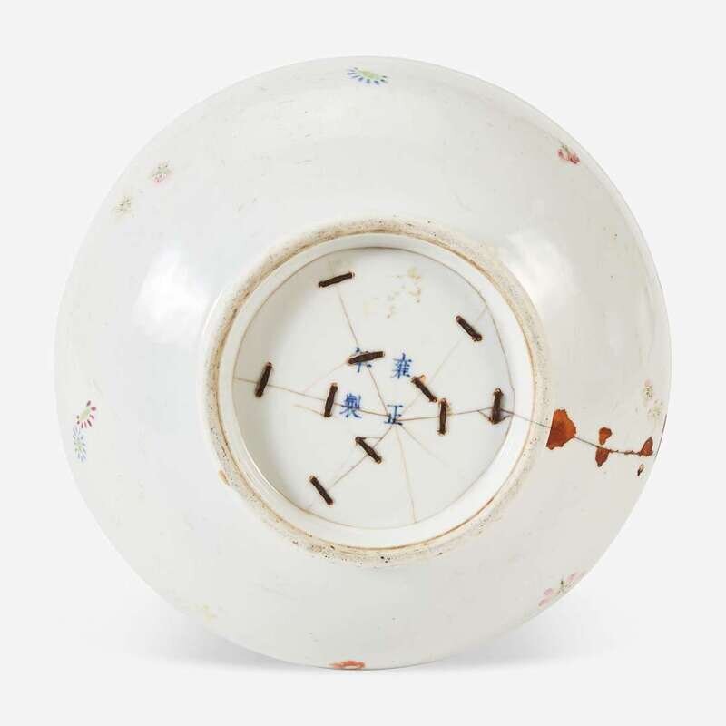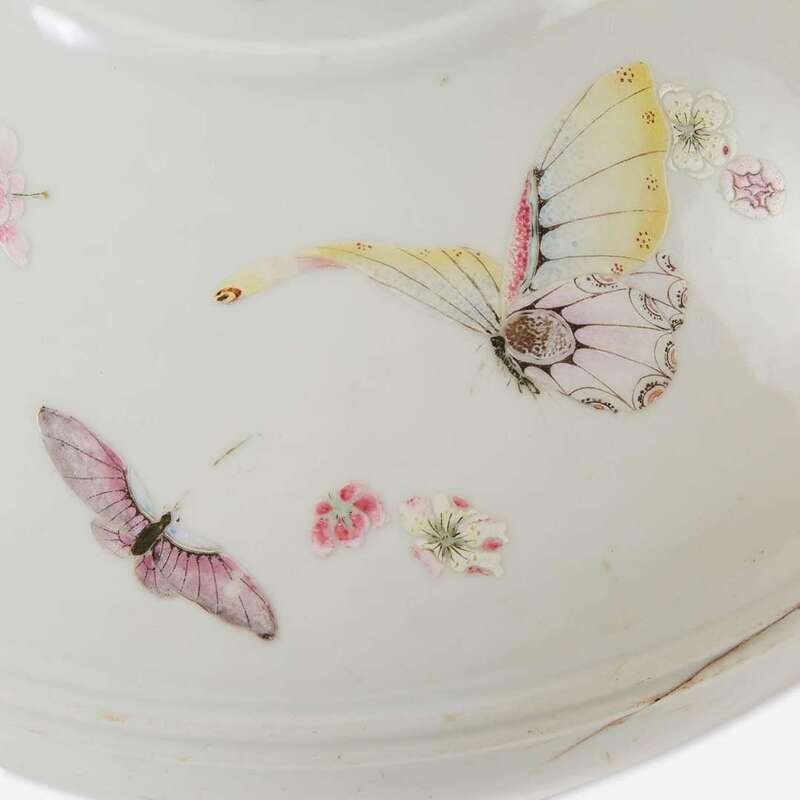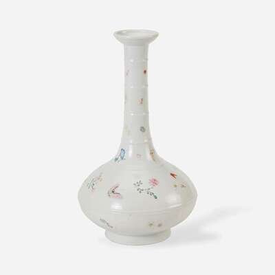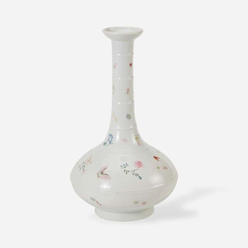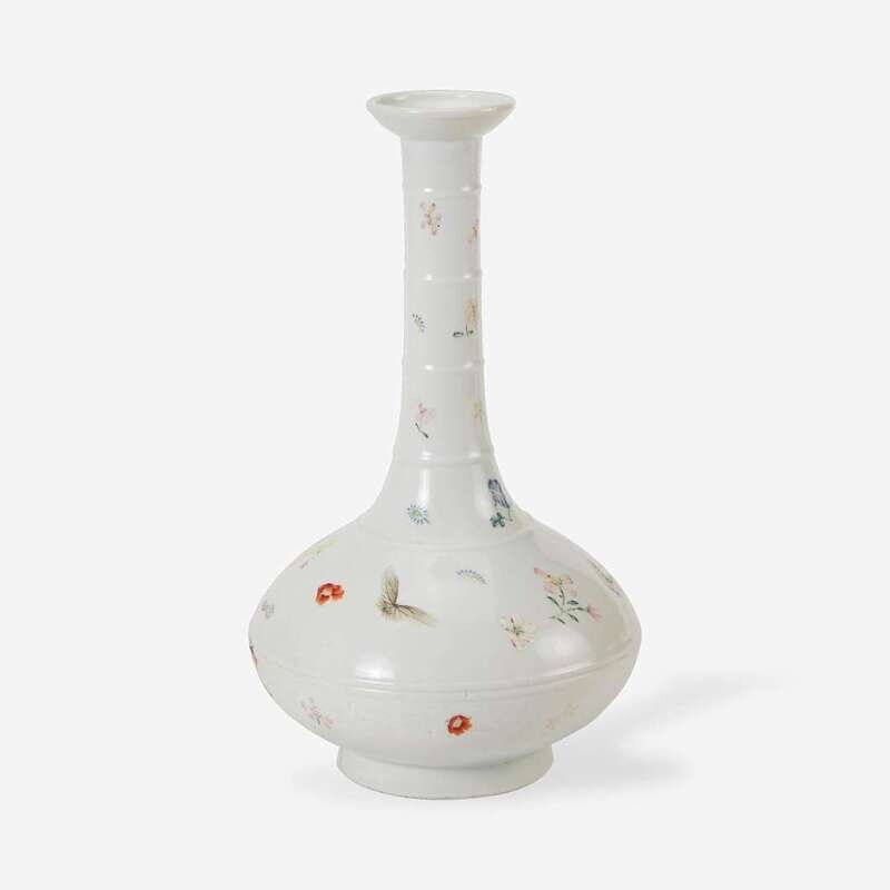 An unusual Chinese famille rose-decorated "Butterflies and Blossoms" bottle vase 珍罕粉彩長頸瓶 Yongzheng four-character mark Qing dynasty 雍正四字青花楷書款 清