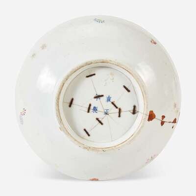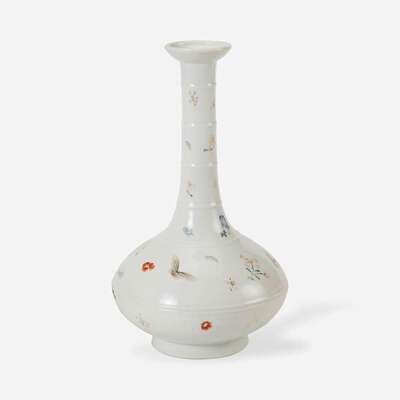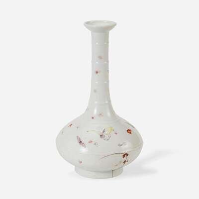 With flared cupped mouth over a long tapered neck with five evenly-spaced "bow string" rings, over a compressed spherical body with two additional "bow string"rings at the waist, raised on a vertical foot, finely decorated with a variety of scattered blossoms and colorful butterflies