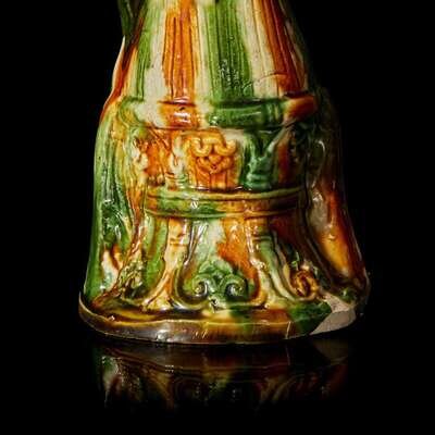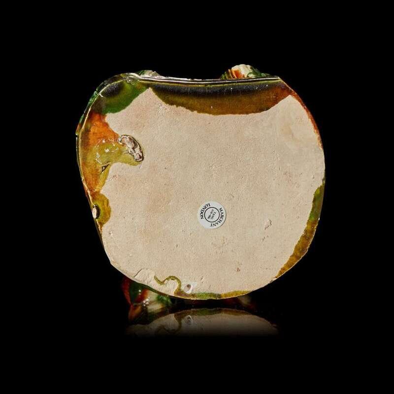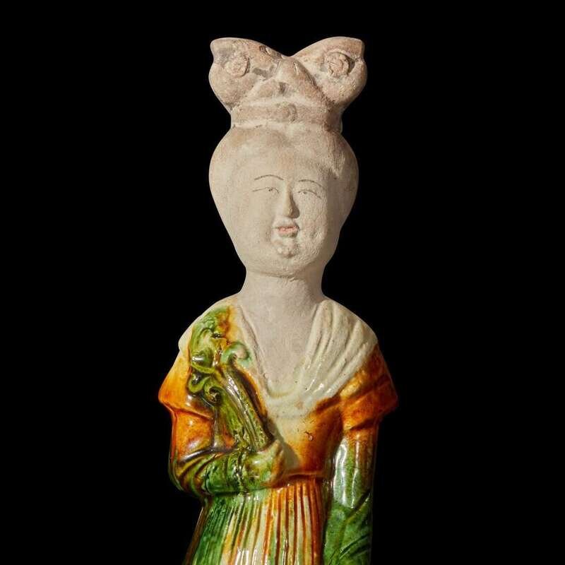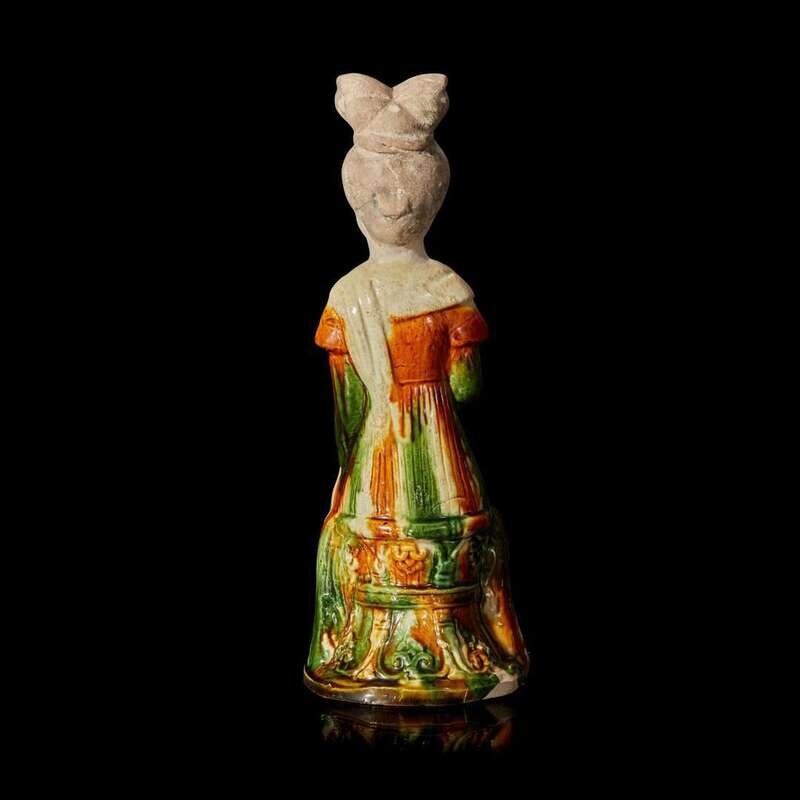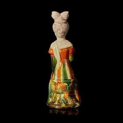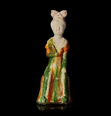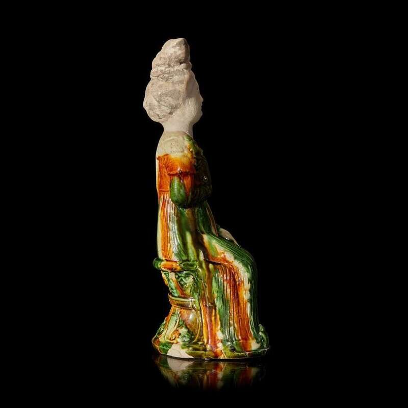 The court lady seated on a stool, the lady's unglazed face gracefully painted with fine pigments, topped by a classical Tang dynasty "shuanghuan ji" hair style, the right hand holding a floral spray against her chest, the other hand rests on her knee, a cream-glazed scarf draped to her left shoulder, the elongated, finely-pleated amber, cream and green-glazed robe extended to her shoes with upturned toes, the waisted stool decorated with molded lappets with conjoined foliate scroll motif, all on a short, shaped base. Accompanied by an original Oxford Authentication Centre Thermoluminescence Test result no. 866d60, dated 12 February 1997 stating the results are consistent with the suggested period of manufacture.
