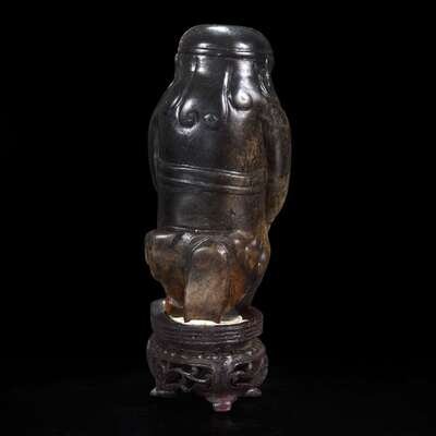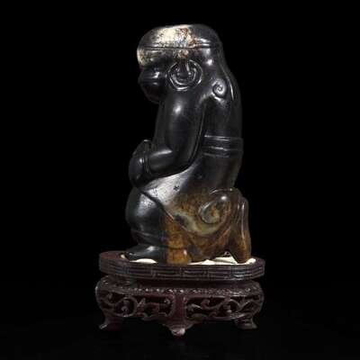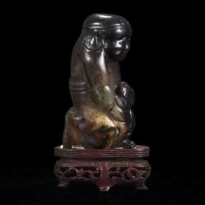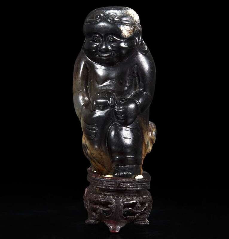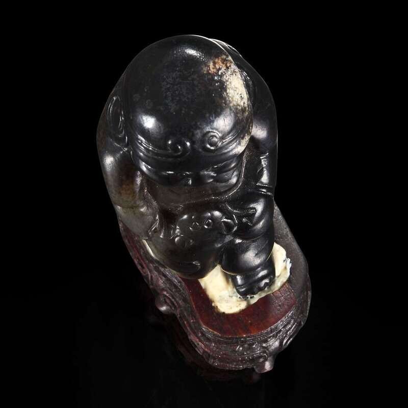 An unusual Chinese dark brown-black jade carving of a Lohan 笑狮罗汉玉雕 Ming dynasty or earlier ????