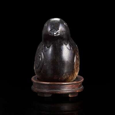 The quail carved in a recumbent posture with round eyes and short beak, incised lines outlining its tail, stylized wings and feathers, lustrously polished surface; with later wood stand and fitted cloth box.