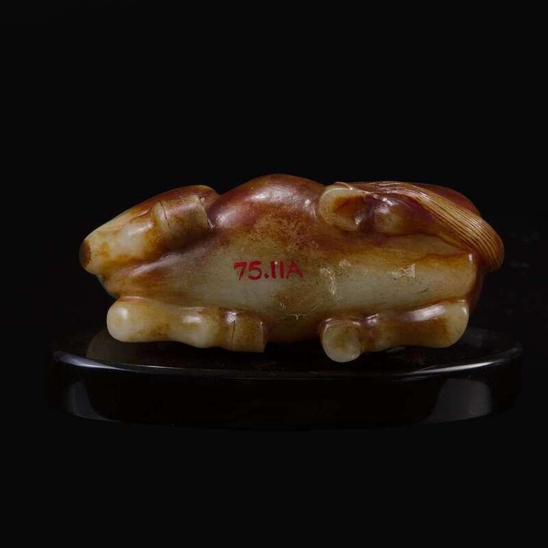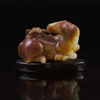 The horse depicted recumbent with its legs tucked underneath and head turned sharply towards the monkey on its back, with realistically-depicted hoofs and sinewy limbs, the monkey clambering up the horse's hindquarters reaching for the horse chin, fine incised lines suggesting horse mane and tail; with later associated acrylic stand, brocade box.
