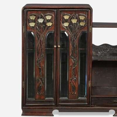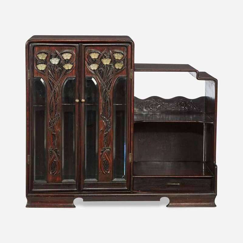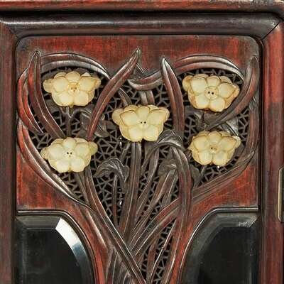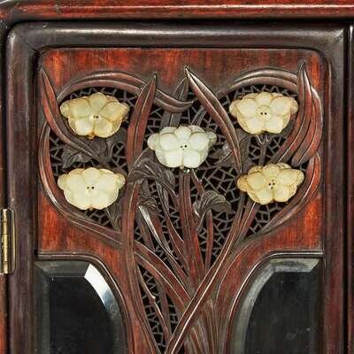 Of stepped form, the left side with two doors with beveled glass, centered by stylized foliage culminating in flowers represented by inlaid Chinese carved white jade floriform ornaments, the ornaments Ming to Qing dynasty, adjacent to shaped shelves and a narrow drawer, the timber an attractive dark hardwood with fine figure.