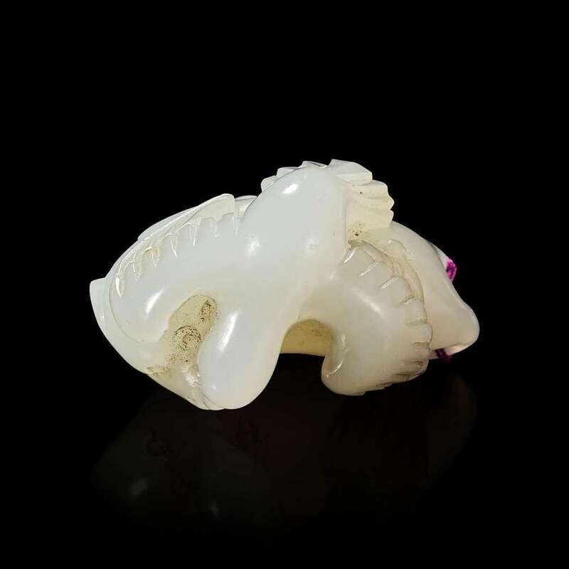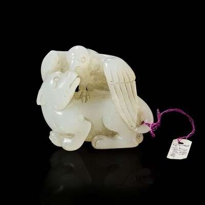 Carved as a bird holding on to beast's back, pecking at the beast's nose; the beast in a recumbent posture, gazing up at the bird, the stone of a very even greyish-white tone