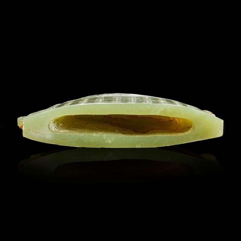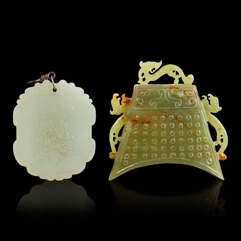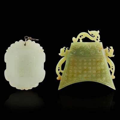A Chinese white jade pendant and celadon jade "bell" 白玉牌饰和青玉钟一组